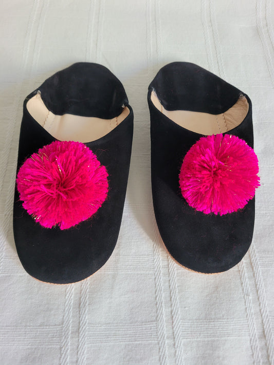 Babouches Noires à Pompons — Artisanales & Élégantes Fait Main au Maroc